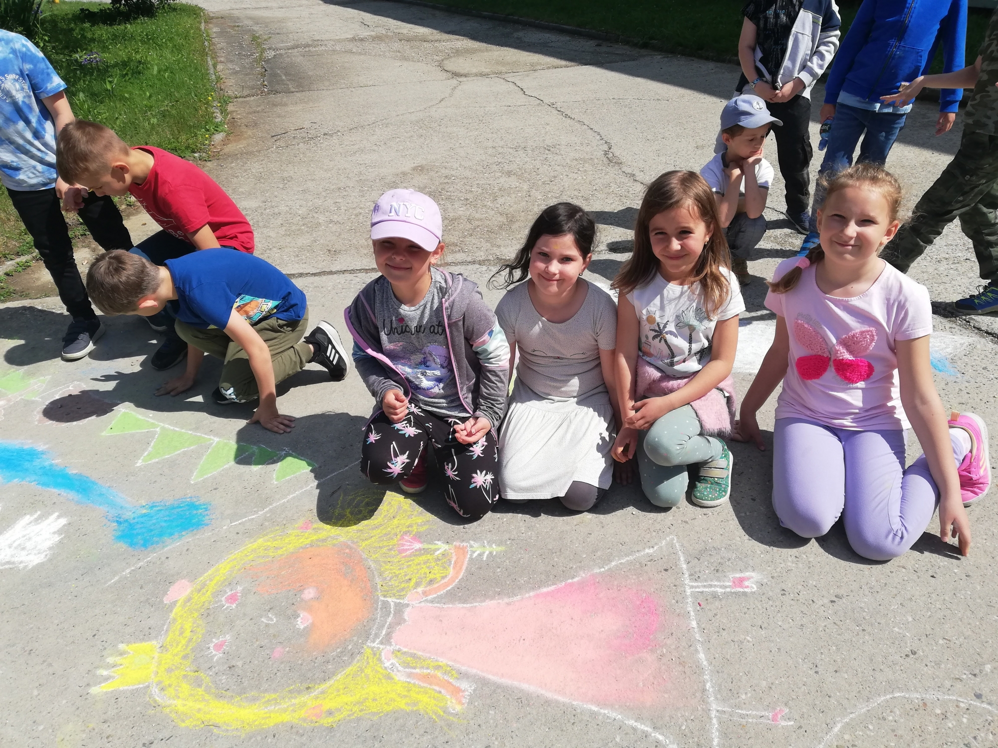 Den dětí si prváčci zpestřili Pohádkovou bojovkou, kterou zahájili pohádkovými kresbami na chodník.