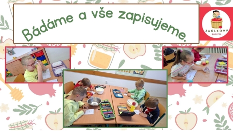 Prvňáčci se proměnili v malé badatele. Zkoumali, co vše se skrývá uvnitř jablka, pod lupou si prohlíželi drobná semínka a zjišťovali, jestli jablíčko ve vodě plave, nebo spadne ke dnu. Dozvěděli se také, co způsobuje zabarvení jablíček. Všechny své poznatky pečlivě zapisovali do badatelského deníčku.