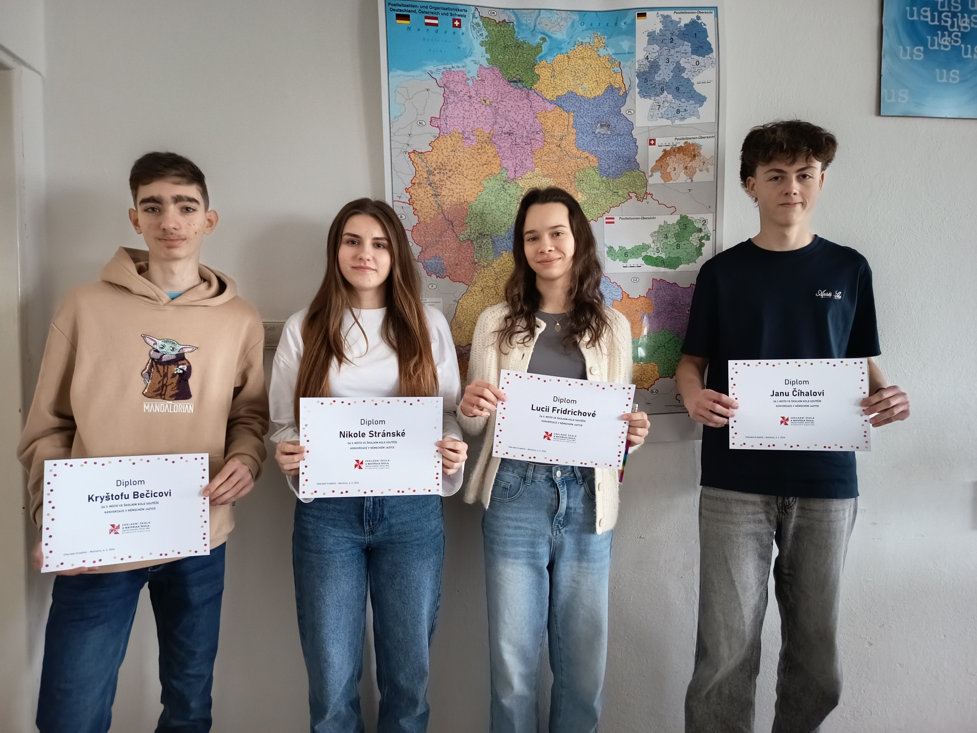 Mezi němčináři zvítězil Jan Číhal z 9.A, na druhém místě skončila Lucie Fridrichová z 9.B, o třetí místo se dělí Nikola Stránská a Kryštof Bečica, oba z 9.B.