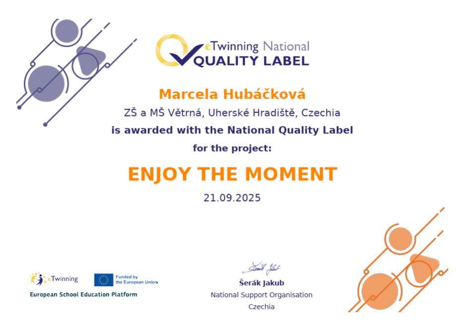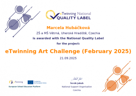 Naše další eTwinningové projekty ENJOY THE MOMENT a eTwinning Art Challenge (February 2025), které byly také realizovány v minulém školním roce, získaly Národní certifikáty kvality, což také potvrzuje jejich vysokou úroveň a přínos pro výuku i mezinárodní spolupráci.