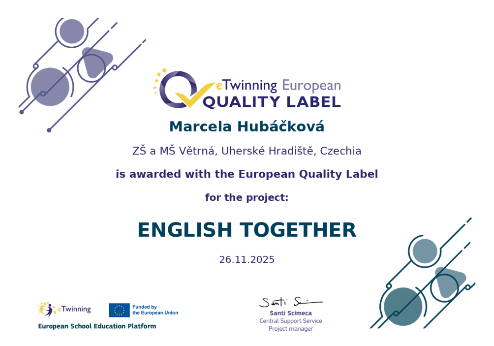 S velkou radostí oznamujeme, že náš eTwinningový projekt ENGLISH TOGETHER (realizovaný s našimi deváťáky v minulém školním roce) získal nejvyšší eTwinningové ocenění na evropské úrovni – Mezinárodní certifikát kvality (European Quality Label).