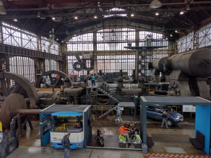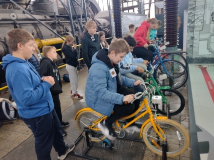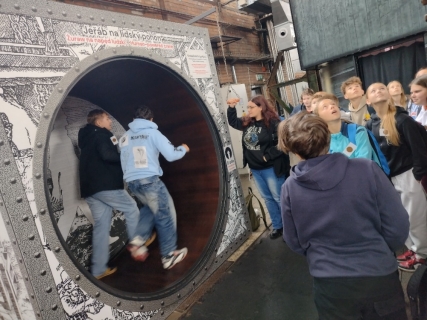 Dopoledne jsme si prošli s paní průvodkyní Malý svět techniky, který se nachází v bývalé VI. energetické ústředně z roku 1938. V názvu je sice slovíčko "malý", ale když se rozhlédnete, uvidíte samé "velké věci", které lidstvo posunuly kupředu. Všechny exponáty na ploše 600 metrů čtverečních jsou interaktivní, vše je dovoleno vyzkoušet. A tak jsme jezdili na kole, na šlapadlech, na motorkách i v autech, chvilku jsme byli i pod hladinou moře v ponorce, stali jsme se kapitánem lodi. Testovali jsme potrubní poštu, navštívili jsme obráběcí dílny i nově otevřenou kovodílnu. Vyzkoušeli jsme stříhání, ohýbání či ražení plechu. A někteří si vyrobili svůj vlastní výrobek. Jednotícím prvkem celého programu je vize Julese Verna.