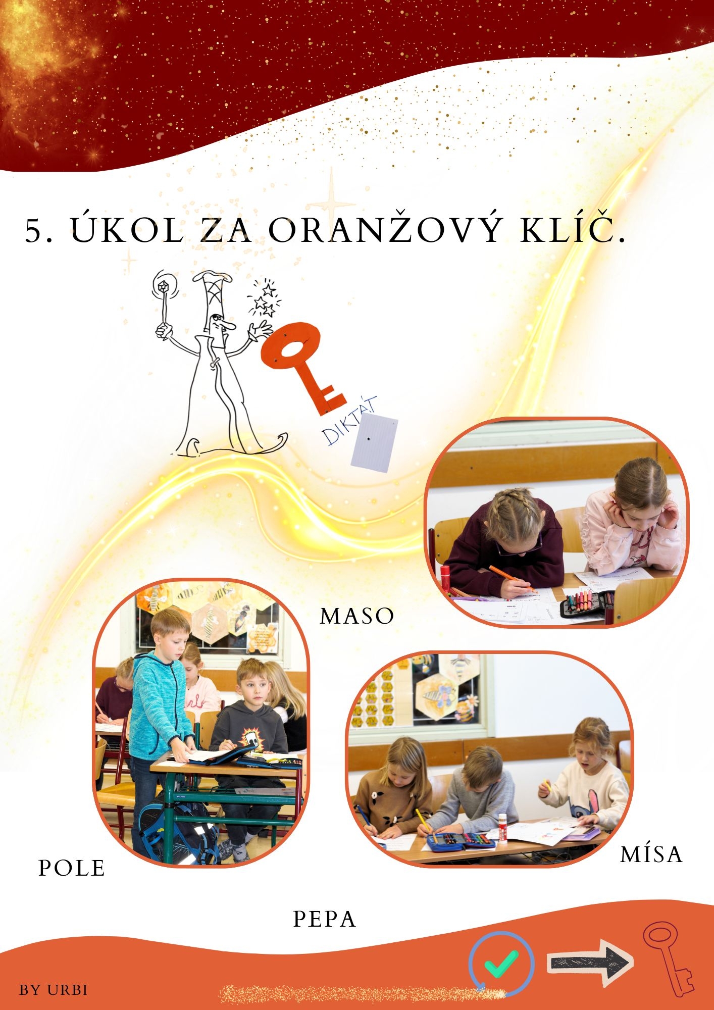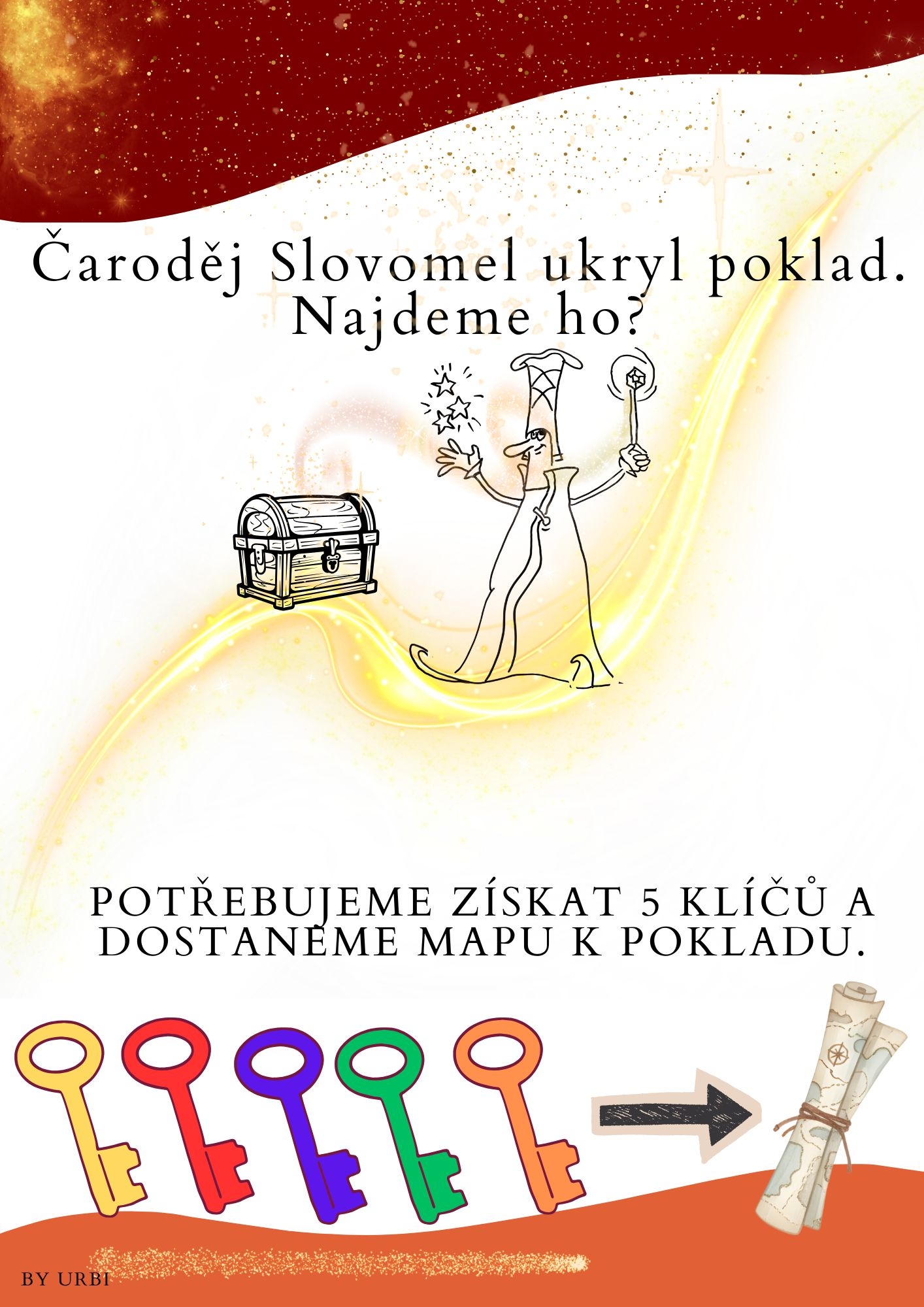 Žáci potřebovali získat tajemnou mapu, která je měla dovést až k ukryté truhle s pokladem. Aby ji však obdrželi, potřebovali získat od kouzelníka Slovomela pět kouzelných klíčů – žlutý, červený, modrý, zelený a oranžový. Každý klíč bylo možné získat jen tehdy, pokud třída zvládla správně splnit jeden z připravených úkolů.