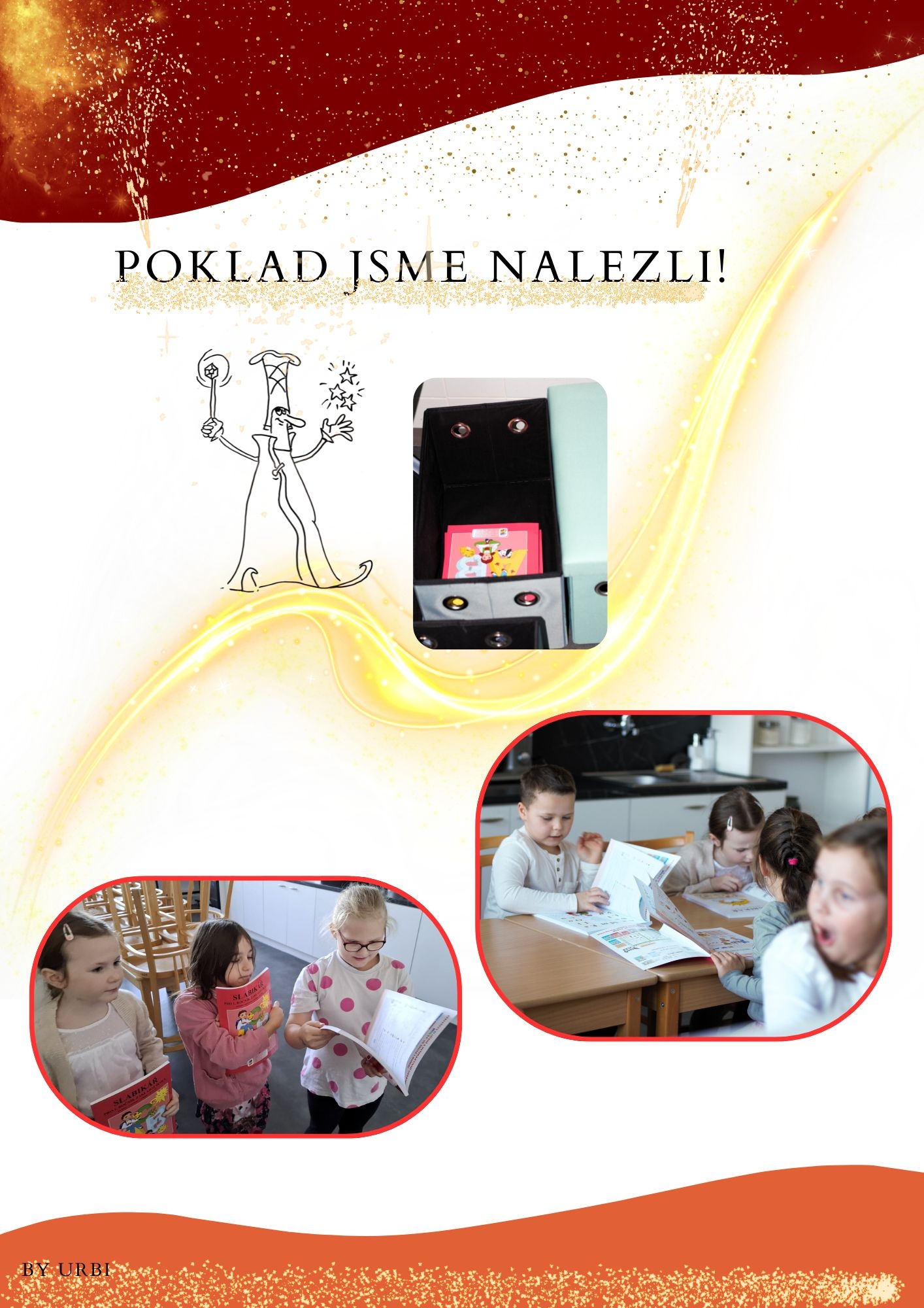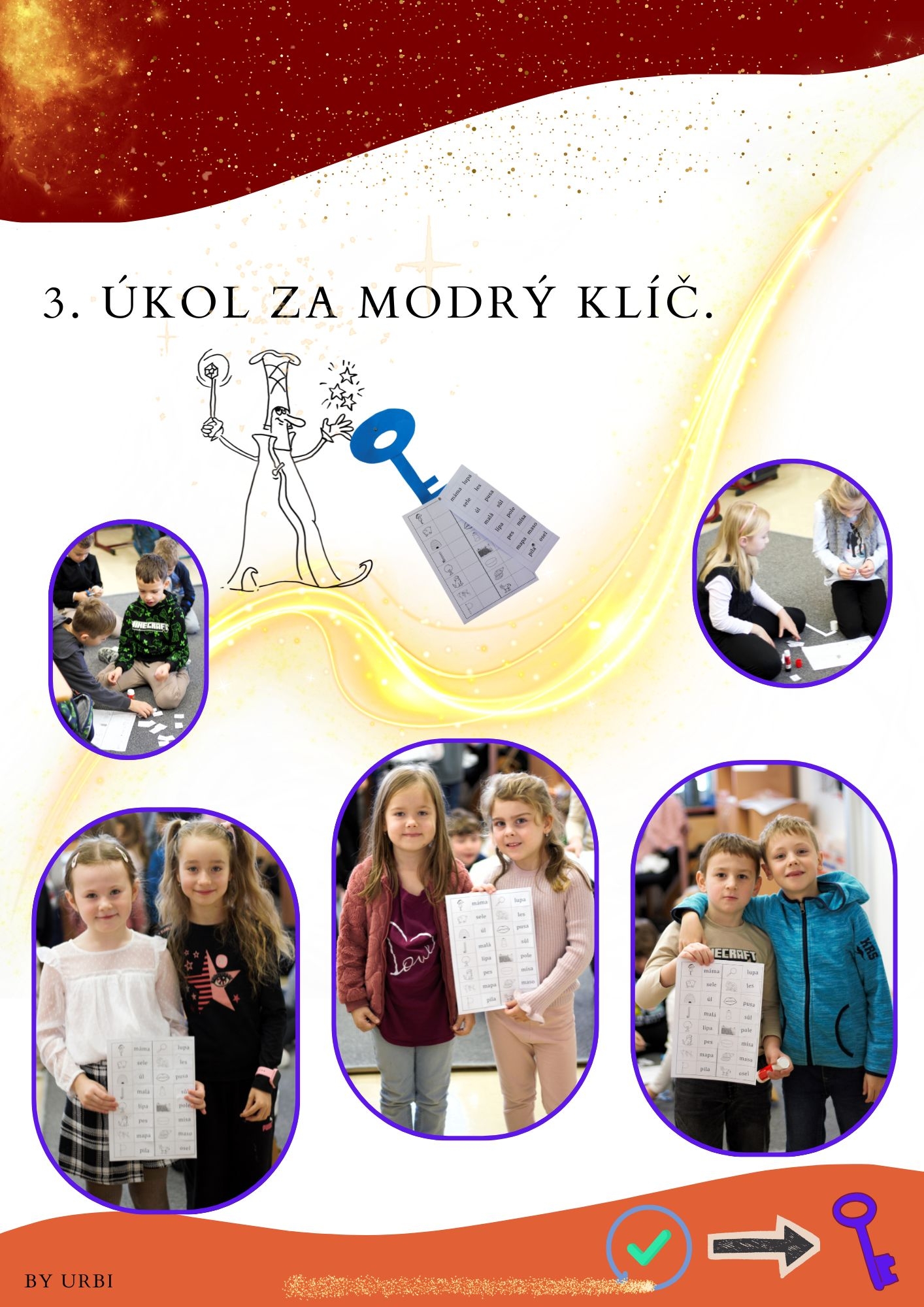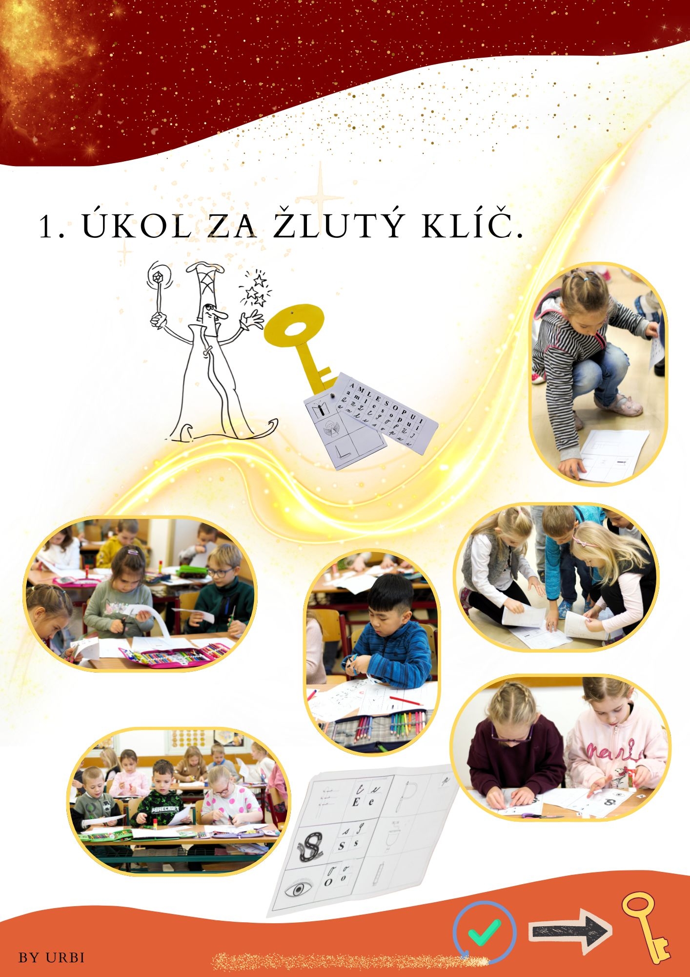 Celkem na ně čekalo pět zábavných stanovišť, která prověřila jejich čtenářské dovednosti, spolupráci i bystré uvažování. Prvňáčci se s nadšením pustili do práce – luštili, skládali, četli, hledali a pomáhali si navzájem. Za každý splněný úkol si vybarvili jeden klíč, až nakonec získali všechny.