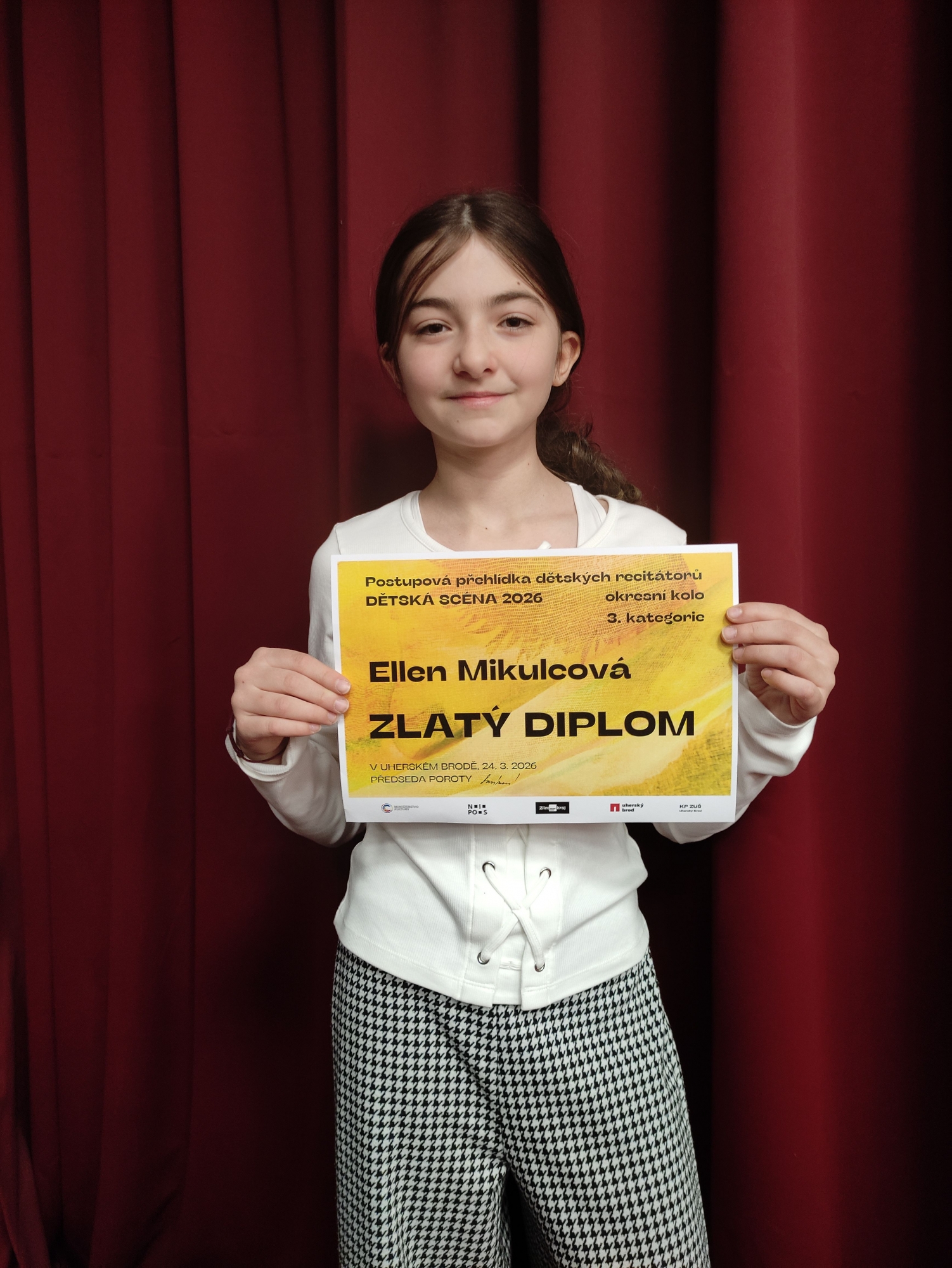 Ellenka že 6. B uspěla v okresním kole recitační přehlídky a jako jediná ve své kategorii postupuje do kola krajského. Držíme jí pěsti.
