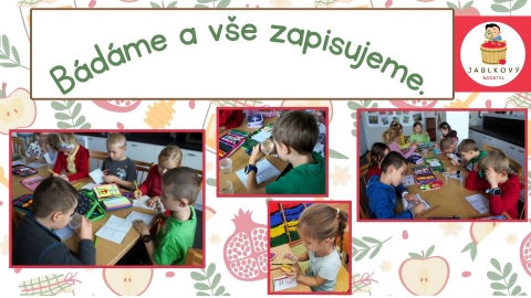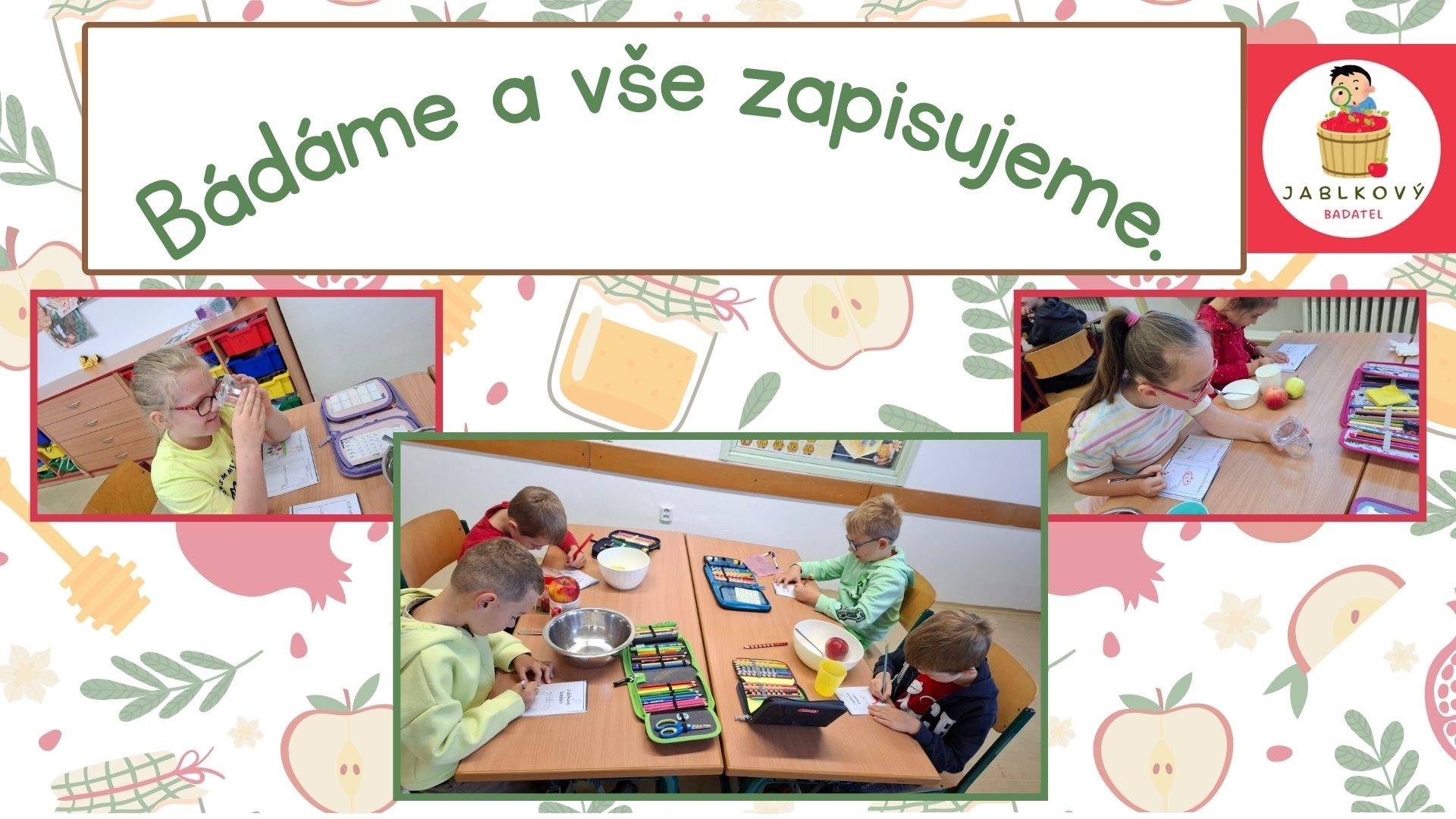 Prvňáčci se proměnili v malé badatele. Zkoumali, co vše se skrývá uvnitř jablka, pod lupou si prohlíželi drobná semínka a zjišťovali, jestli jablíčko ve vodě plave, nebo spadne ke dnu. Dozvěděli se také, co způsobuje zabarvení jablíček. Všechny své poznatky pečlivě zapisovali do badatelského deníčku.