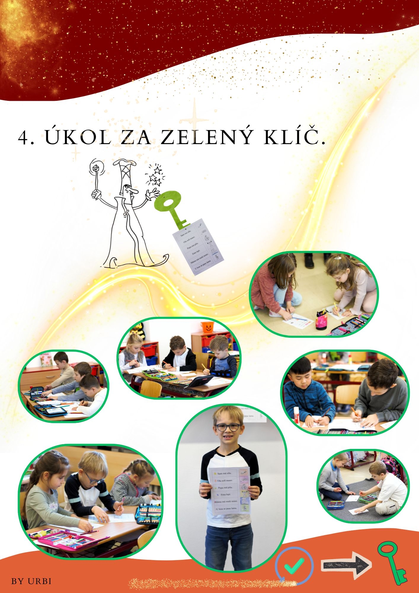 Celkem na ně čekalo pět zábavných stanovišť, která prověřila jejich čtenářské dovednosti, spolupráci i bystré uvažování. Prvňáčci se s nadšením pustili do práce – luštili, skládali, četli, hledali a pomáhali si navzájem. Za každý splněný úkol si vybarvili jeden klíč, až nakonec získali všechny.