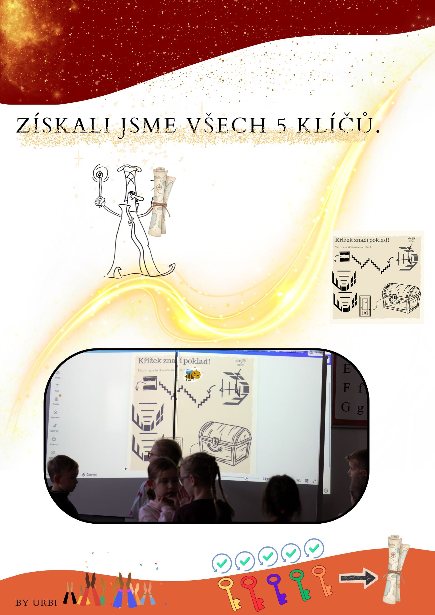Žáci potřebovali získat tajemnou mapu, která je měla dovést až k ukryté truhle s pokladem. Aby ji však obdrželi, potřebovali získat od kouzelníka Slovomela pět kouzelných klíčů – žlutý, červený, modrý, zelený a oranžový. Každý klíč bylo možné získat jen tehdy, pokud třída zvládla správně splnit jeden z připravených úkolů.